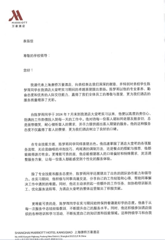 在实习期间,学生们不仅将课堂所学理论知识与实际工作紧密结合,还积极适应快速变化的工作环境,展现了高度的责任心和团队协作精神。多家酒店在感谢信中特别提到了我校学生的出色表现:“贵校学生专业知识扎实,工作态度积极,他们在实习期间所展现的专业素养与敬业精神,不仅为酒店注入了新的活力,更在无形中提升了我们的服务质量与整体形象”;“衷心感谢贵校培养了如此优秀的学生”......特别是十余位表现突出的学生,凭借其出色的服务意识和解决问题的能力,拿到了优秀实习生的荣誉称号,陈梦雨和陈之怡同学还获得了酒店对个人写的表扬信和感谢信。