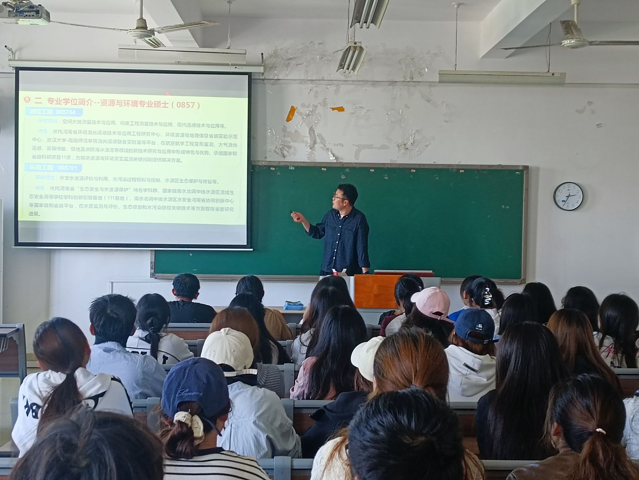 宣讲会上,南阳师范学院地理科学与旅游学院毋宇斌老师向同学们介绍了学院基本情况与学科建设成绩,并从学院师资队伍、专业优势、科研成果、人才培养、招生政策、招生计划、考试科目设置及奖助体系等方面进行了详细的讲解。毋宇斌一行鼓励我院学子积极备考,并对学生关心的各种问题进行了详细的解答和交流。