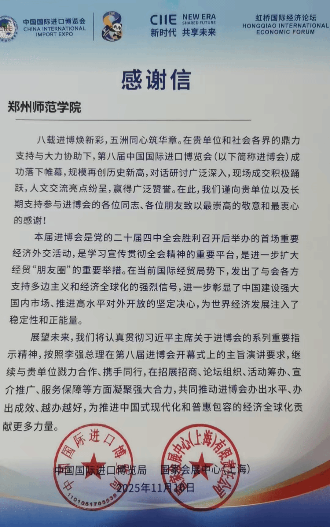 连续多年获感谢信,既是对学生实践能力的肯定,更是对我院以赛促学、以践育人教学理念的检验。自进博会举办以来,专业始终将其作为核心实践平台,通过“校企协同培训+岗位实战锻炼+复盘总结提升”的模式,让学生在国际大型活动中积累经验、提升能力。未来,我院旅游管理专业将继续深化实践教学改革,拓展更多实践渠道,助力学生在专业领域持续成长,为旅游行业培养更多兼具国际视野与实践能力的高素质人才。