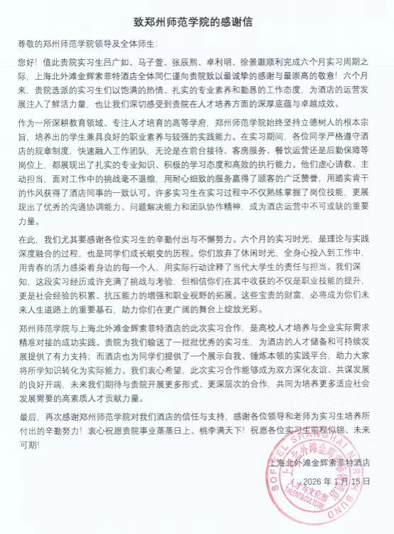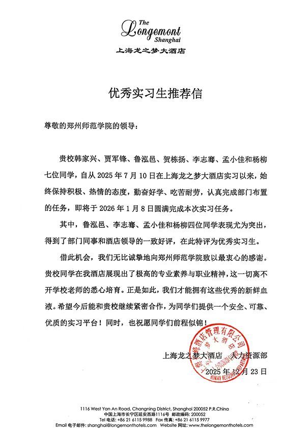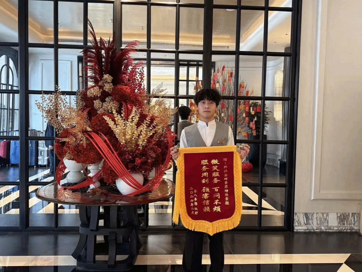 本次实习是我院旅游管理专业实践育人体系的核心环节,依托长期稳定的校企合作平台,精准对接上海高端酒店前厅、客房、餐饮等核心岗位需求,为学生搭建了从课堂理论到职场实战的专业桥梁。实习过程中,同学们迅速完成从校园到职场的角色转变,将服务礼仪、酒店管理实务、客户沟通技巧等课堂所学灵活运用到工作实践中。面对酒店日常运营的高强度工作、多样化服务需求以及展会接待、大型活动保障等专项任务,同学们始终保持积极饱满的工作状态,以细致严谨的作风、主动担当的意识完成各项工作要求,成为酒店一线服务的重要生力军。各实习单位在感谢信中多次称赞我院学生“专业基础扎实、适应能力突出、责任意识强、服务态度优”,高度认可学生的综合素养与实践能力,部分酒店还为表现优异的学生出具专业推荐信,为其未来职业发展筑牢基础。数十名同学凭借实习期间的亮眼表现获评酒店“优秀实习生”,一名同学更是因在服务中想宾客之所想、急宾客之所急,以贴心、暖心、用心的专属服务打动宾客,收获宾客专程赠送的锦旗,成为实习学子中的服务典范。