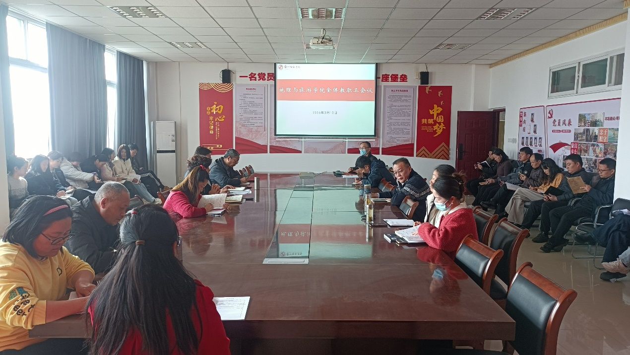 2026年3月10日下午,地理与旅游学院在尚德楼7609会议室召开了2025-2026学年第二学期全体教职工会议,传达学校新学期相关工作会议精神,明确新学期工作目标与重点任务,凝聚全院教职工奋进力量,部署推进学院各项工作高质量开展。