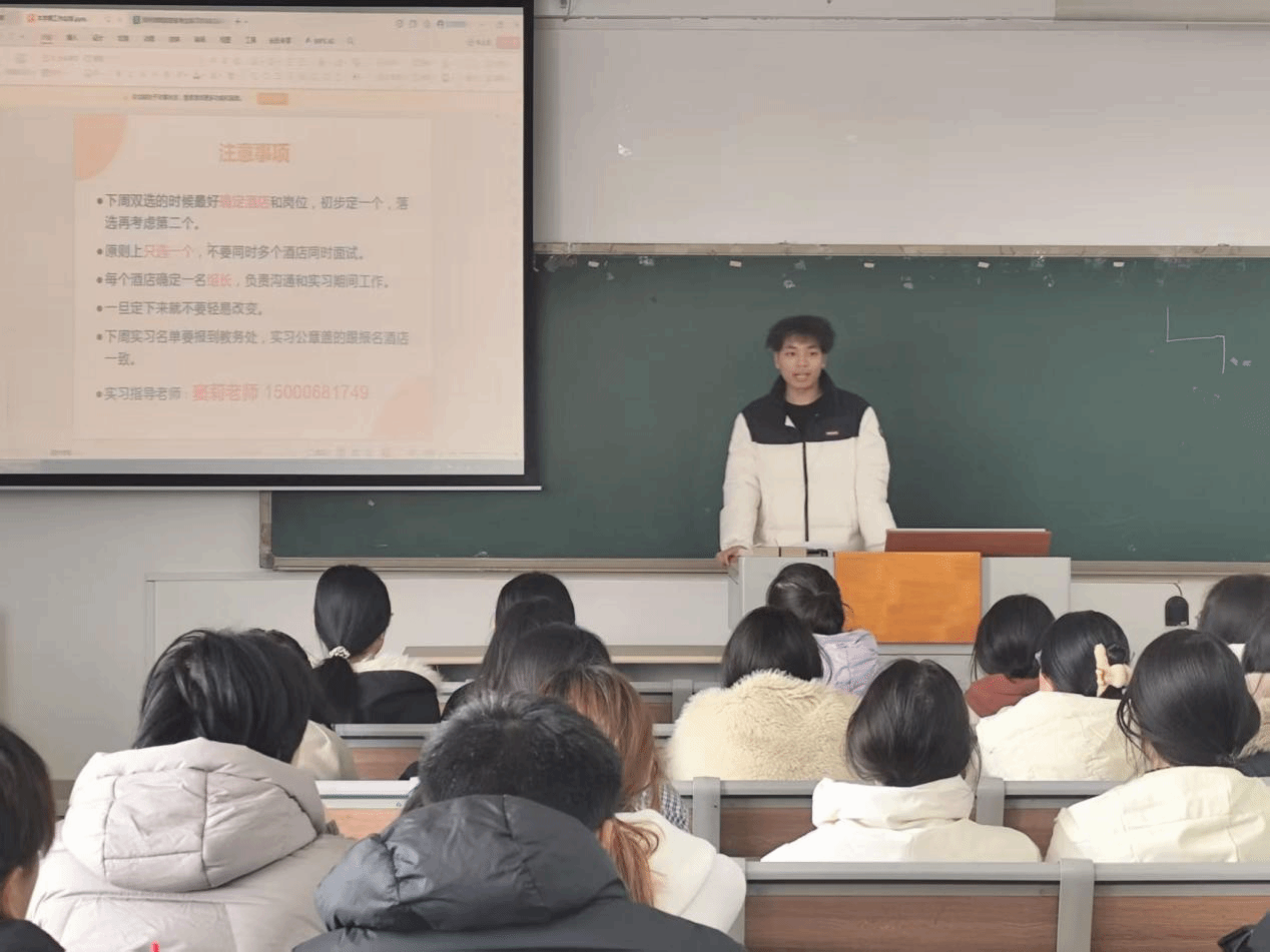 此次动员大会的召开,不仅为24级旅游管理专业学生厘清了实习思路、明确了实习要求,更有效缓解了学生对实习的焦虑情绪,为后续毕业实习工作的顺利开展奠定了坚实基础。下一步,旅游管理系将持续做好实习全过程跟踪指导与服务工作,加强与实习单位的协同对接,全方位保障学生实习期间的学习与成长,助力学生顺利完成从校园到职场的过渡,为未来职业发展筑牢根基。